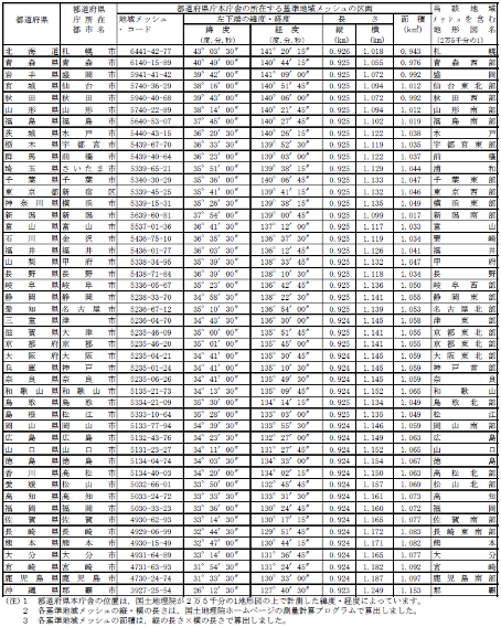このように、地域メッシュは区分の仕方が同じであっても位置によって大きさが異なり、特に遠距離間で地域メッシュ統計を比較する際には、形状と大きさについて十分注意を払わなければならない。